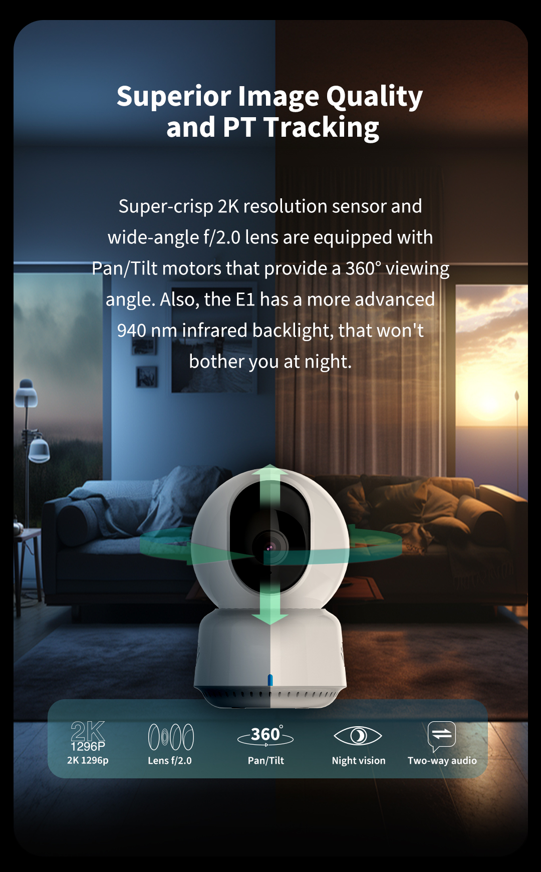 Bắt mọi chi tiết trong độ phân giải siêu cao 2K tuyệt đẹp. Theo dõi sự kiện thời gian thực trước camera bất cứ lúc nào. Đảm bảo an toàn và sức khỏe của trẻ em, hoặc kiểm tra xem họ có cần sự trợ giúp hoặc đang gặp vấn đề gì không. Nó cũng bao gồm tính năng giao tiếp âm thanh hai chiều và khả năng quan sát ban đêm. Ngay cả trong các khu vực lớn, bạn vẫn có thể sử dụng chức năng PT (quay và nghiêng) để theo dõi và ghi lại, với góc nhìn 360°. Mọi thứ trở nên thuận tiện và an tâm.