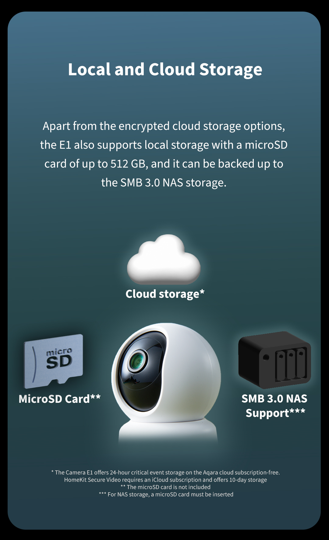 Camera thông minh E1 tích hợp với các hệ sinh thái của bên thứ ba như Apple Home, Google Home và Amazon Alexa. Nó hỗ trợ Apple HomeKit Secure Video, đảm bảo phân tích và mã hóa riêng tư của video được ghi lại trên các thiết bị trung tâm nhà của bạn (Apple TV hoặc HomePod) và lưu trữ iCloud an toàn*. Với gói iCloud+, bạn có thể truy cập 10 ngày hoạt động gần đây từ một hoặc nhiều camera.