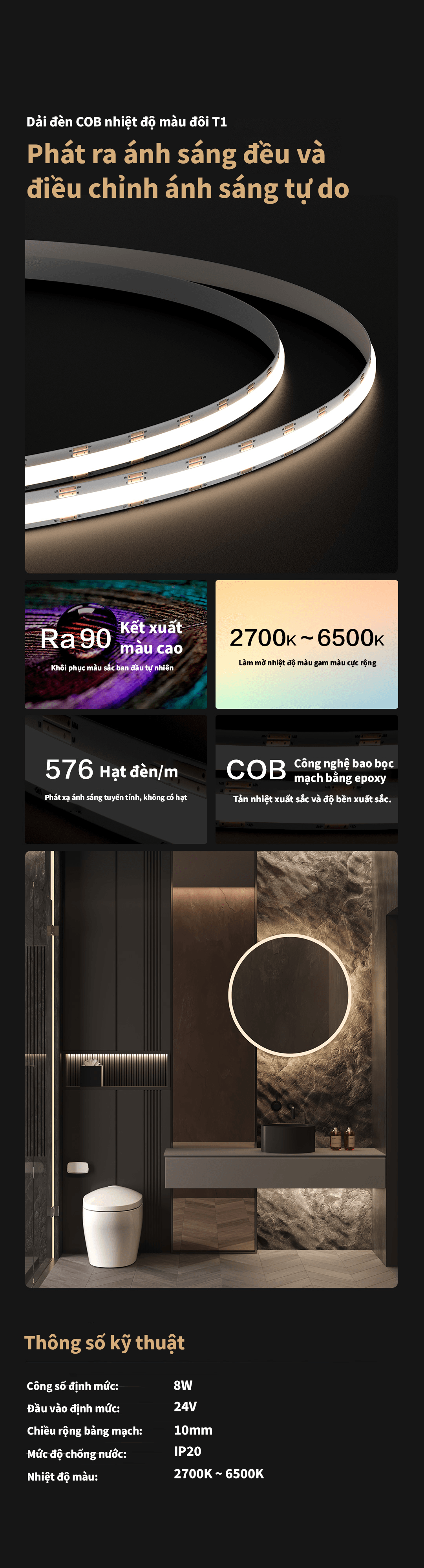 Là là dải đèn led mật độ cao được chế tạo bằng cách bọc COB, có thể làm giảm điện trở nhiệt của hệ thống mạch dải mật độ cao, cải thiện đáng kể tuổi thọ của đèn LED, mật độ thông lượng ánh sáng cao, chống chói, nhỏ, và ánh sáng đồng đều và không có vùng tối.Thêm nữa, Dải đèn Cob nhiệt độ màu đôi T1 có khả năng điều chỉnh ánh sáng dễ dàng từ ánh sáng ấm sang ánh sáng lạnh