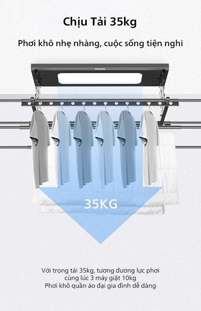 Giàn phơi thông minh Philips SDR501-AA0 được xem là một trong những giàn phơi có khả năng chịu tải cao nhất trên thị trường, với khả năng chịu lên đến 35kg. Điều này cho phép người dùng dễ dàng phơi đồ cho cả gia đình chỉ với một chiếc giàn phơi duy nhất.