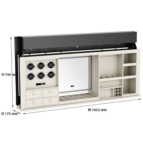 Remote này còn được tích hợp dấu vân tay, do đó không phải ai cũng có thể tùy ý sử dụng. Bán kính nhận tín hiệu của remote là 30m, bạn có thể linh hoạt điều khiển tủ. Khi cần sử dụng, chỉ với một thao tác đơn giản, tủ sẽ nhẹ nhàng hạ xuống, tạo ra một khu vực trang điểm tiện nghi và đầy đủ ánh sáng.