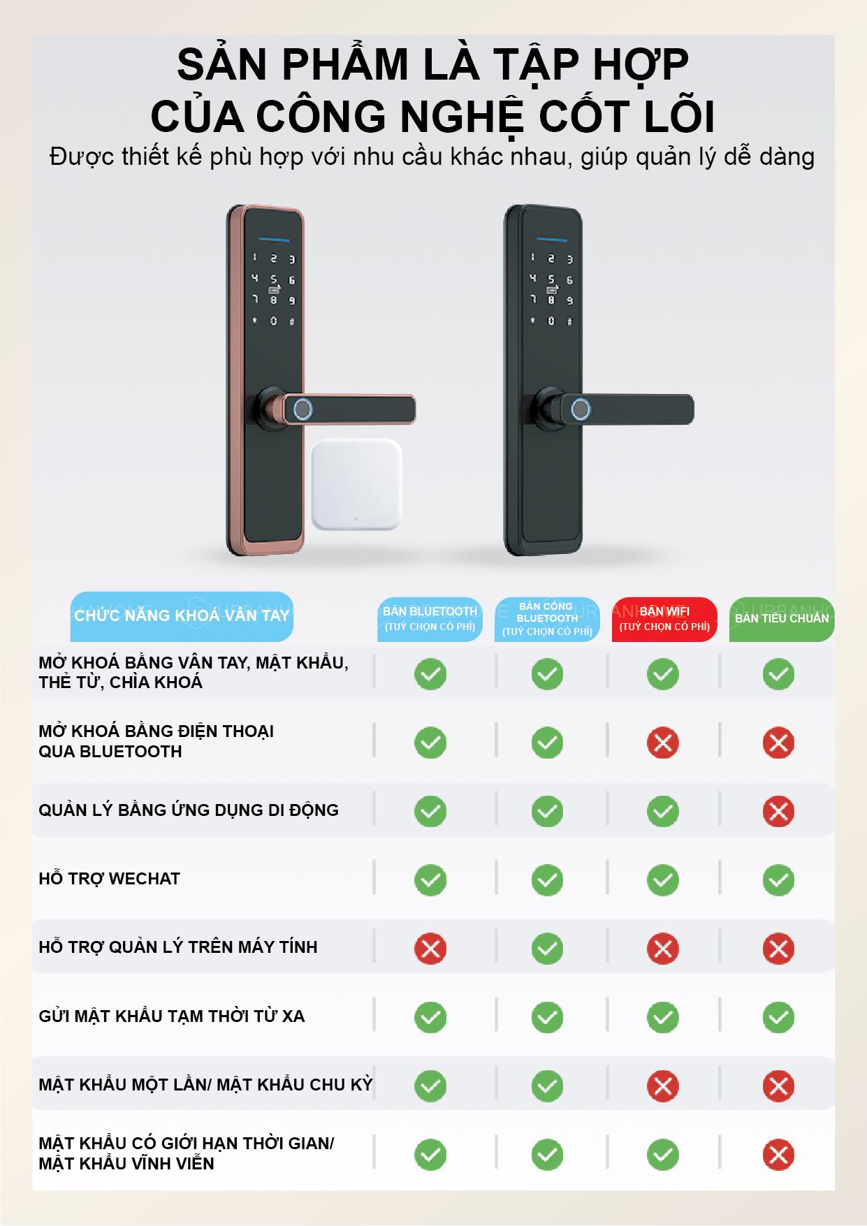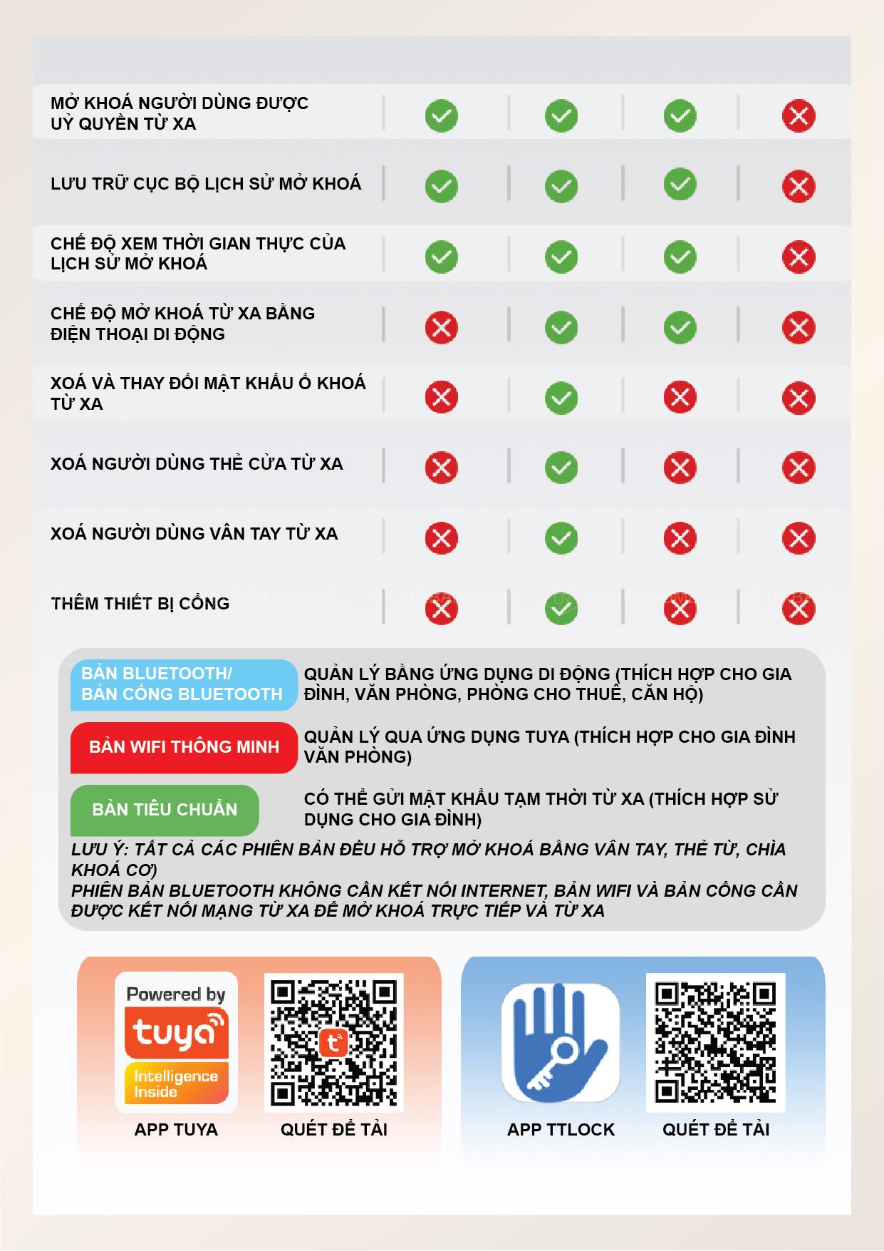 - Chức năng: 5 trong 1 ( Vân tay, Chìa khóa, mã số, thẻ từ, Bluetooth/ App( IOS/ Android))