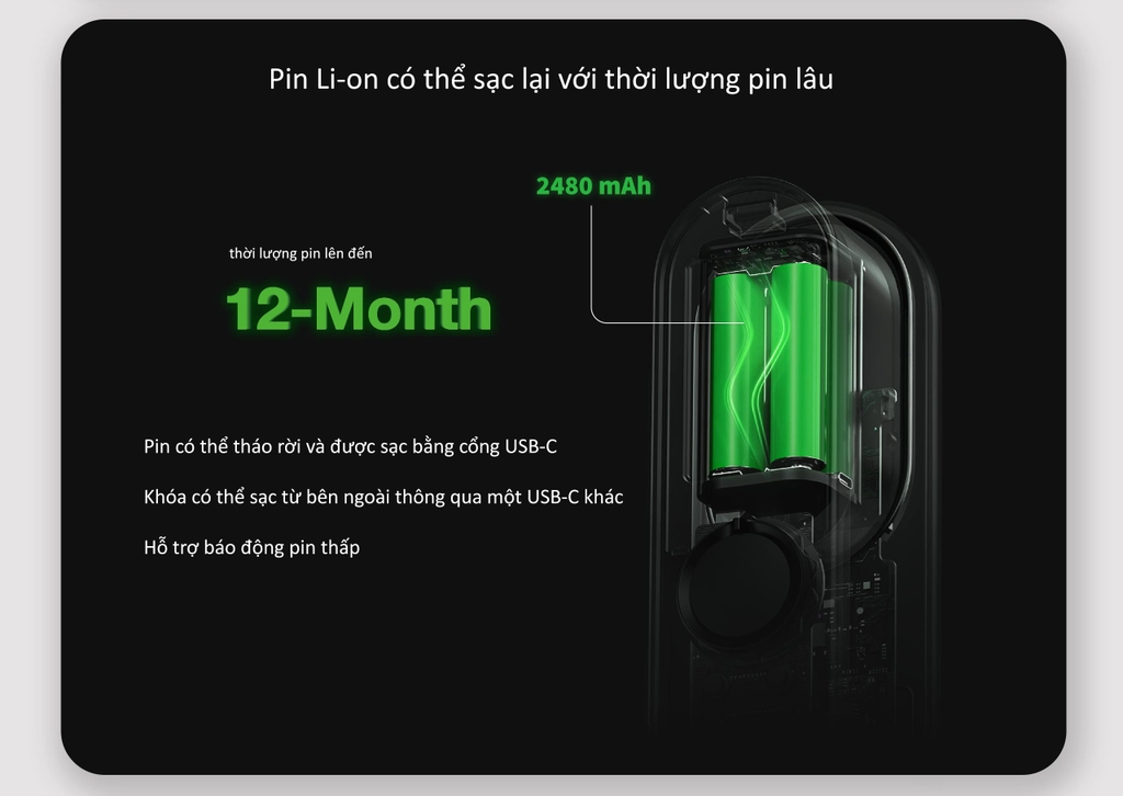 Khóa D100 Zigbe sử dụng 2 Pin công suất 2480mAh, tuổi thọ lên đến 365 ngày. Pin có thể dùng cổng sạc type C để sạc pin.