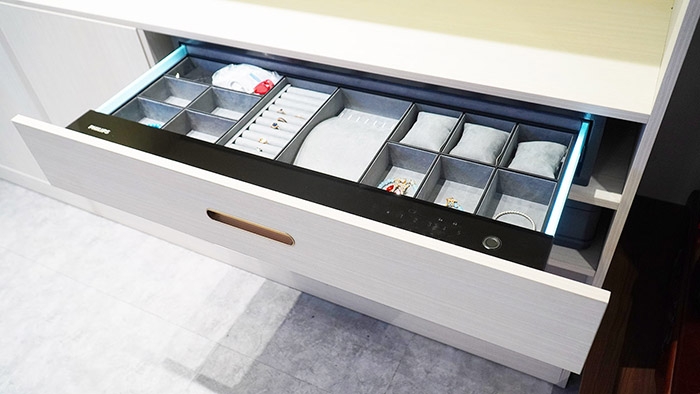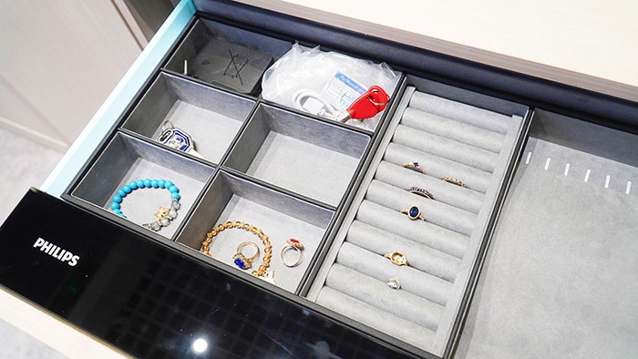 Ngăn kéo được lót nhung mịn màng, loại bỏ nỗi lo trầy xước trang sức, đá quý. Không gian ngăn kéo được phân chia khoa học: khu vực để nhẫn, khu vực cho dây chuyền, khu vực nhỏ hơn cho khuyên tai, đồng hồ, vòng tay, lắc chân,…